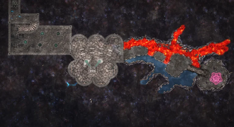 Vor ihnen prangt ein vier Meter breiter Lavastrom und massenhaft glühendes Gestein trennt die Grabungskammer vom Rest der Höhle. Die Wände sind von Erosion gezeichnet und der Untergrund wirkt bröckelig – ein Sprung ist äußert riskant. Langdo wird zuerst von Belegar hinübergeworfen und beginnt, die Höhlenkammern zu untersuchen. Er entdeckt einen dichten Bewuchs mit Delreanpilzen, die für ihre Fähigkeit bekannt sind, Höhlen freizulegen, dabei jedoch einen unangenehmen Geruch zu entwickeln, der besonders elfische Nasen mit tiefem Ekel erfüllt. Langdo sammelt schnell einige Proben und betritt eine weitere Kammer, während Belegar und Hisk nacheinander zu ihm hinüberspringen. Farhiya zögert zunächst. Langdo entdeckt in einer zweiten Kammer rosa schimmernde Trudustblüten, bekannt für ihre heilende, aber auch halluzinogene Wirkung. Doch Langdos Aufmerksamkeit ist nur von kurzer Dauer…