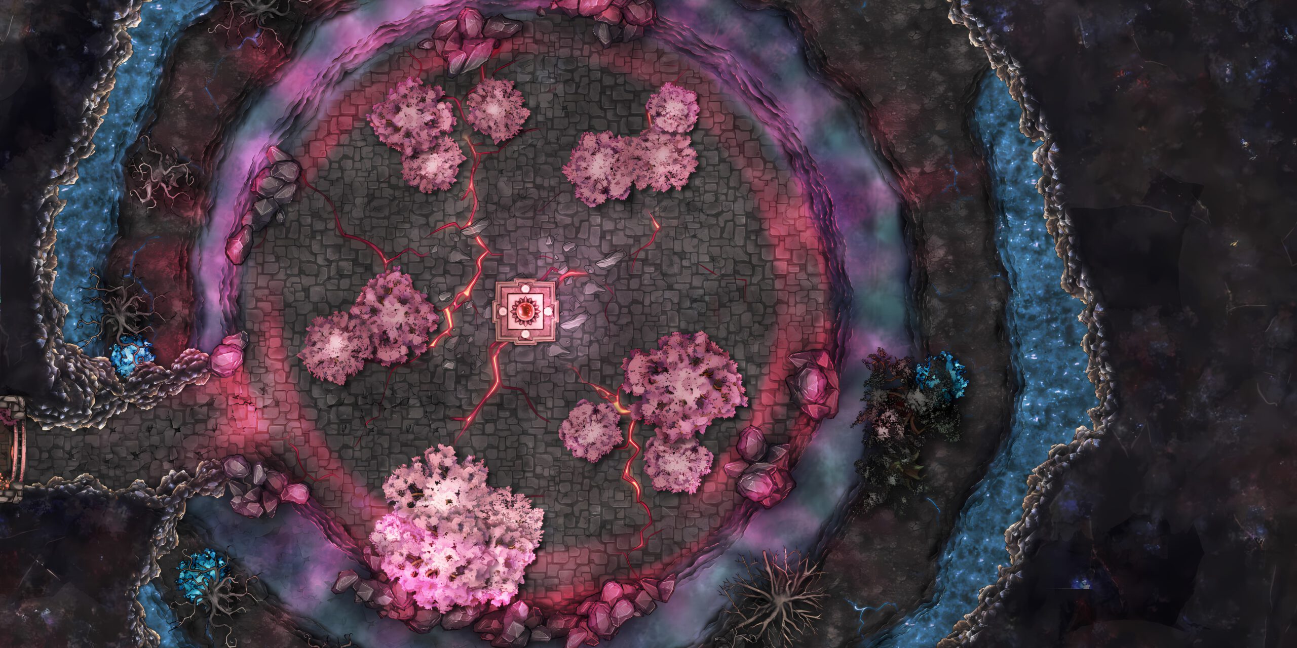 Noch bevor die Gruppe durch das Tor treten kann, erbebt der Boden unter ihren Füßen. Sie gelangen in eine gigantische kuppelförmige Höhle mit einer Plattform in der Mitte, die von drei äußeren Ringe umgeben ist. In ihrem Zentrum befindet sich eine makellose Stele, auf der eine violett funkelnde Sphäre aufgebahrt ist. Ihre magische Präsenz erfüllt den gesamten Raum und selbst Belegar und Hisk spüren die gottgleichen Kräfte, die von ihr ausgehen. In einem Radius von etwa 18 Metern erzeugt die Sphäre eine schützende Aura, die alles in den gleichen violetten Ton hüllt und die gesamte innere Plattform umspannt, nicht aber die äußeren Ringe. Drei an der Zahl. Der Innerste besteht aus Gorstuks heiligem Wasser. Der Mittlere Ring ist von felsiger, karger Beschaffenheit und einige kleinere Bäume wachsen auf ihm. Doch die Bäume wirken kränklich, fast als würden sie Nährstoffmangel leiden und der äußerste Ring könnte dafür ursächlich sein. Denn er besteht aus purer bläulich vom Arnitium getränkter Lava. Es ertönt ein weiteres Mal ein lauter Knall, diesmal in unmittelbarer Nähe. Ein Portal öffnet sich am äußerten Rang der Höhle. Altharion schreitet hindurch, doch er ist nicht allein. Neben ihm befindet sich eine junge Frau, augenscheinlich eine Priesterin dunkler Gottheiten. Sie ist dunkel gekleidet und trägt einen schwarzen Fokusorb in den Händen. Dem aber nicht genug, auch ein weiterer Arnifodex schreitet durch das Portal. Es entbrennt ein Kampf.
